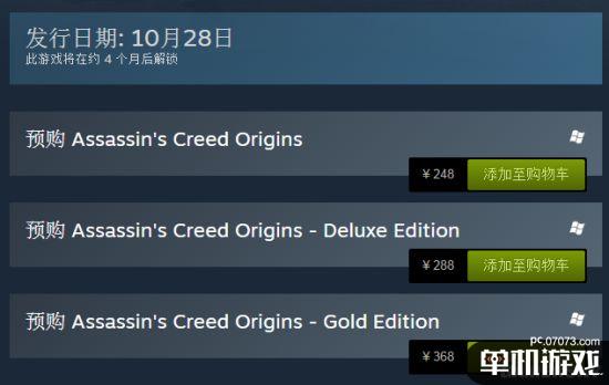 《刺客信条:起源》普通版Steam价格248元,豪华版288元,黄金版368元。