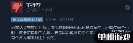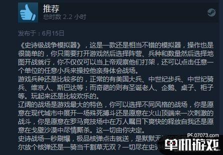 《史诗战争模拟器》目前在Steam上推出的是Beta版本,游戏的总体评价为“多半好评”(75%好评),好评都得归功于本作古怪而又有趣的玩法,也有在今日得知游戏更新中文,前来专门“点赞”的国区玩家。而至于给出差评的理由,一般都是认为本作比较容易玩腻,内容实在太少,所以目前的版本暂时不太推荐。