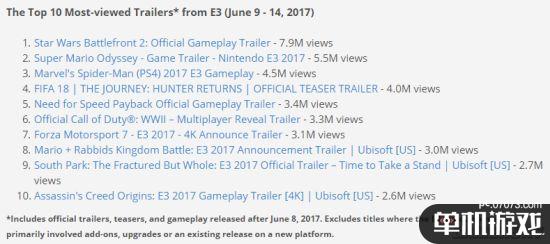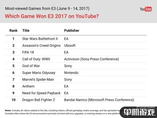 其中第一个榜单是E3期间浏览量最多的游戏,包括了预告片、官方游戏演示、媒体片段和玩家反应等等的浏览量总合,除了第一的《星战前线2》之外,育碧的《刺客信条:起源》位列第二,《FIFA 18》排在第三。
