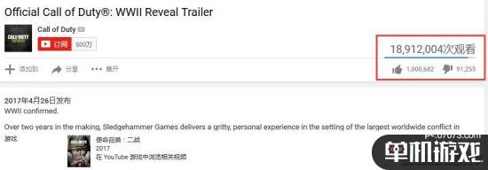 《COD14:二战》首部预告4月27日凌晨正式公布,如今将近两个月时间过去了,这部揭露预告在油管上的点赞数量已经突破1百万,而“踩”的人数只有9万多点。
