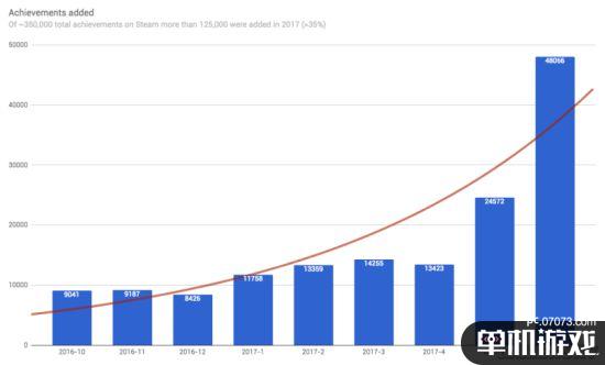 不论这几款游戏的销量是升是降,在Steam平台上这一类以成就为主的游戏都正以肉眼可见的速度不断增加。根据一位名为Luchaos的玩家的统计(他是成就爱好者社区100Pals的成员之一),从去年年底开始,Steam上成就的数量就飞速增长,具体数据如下: