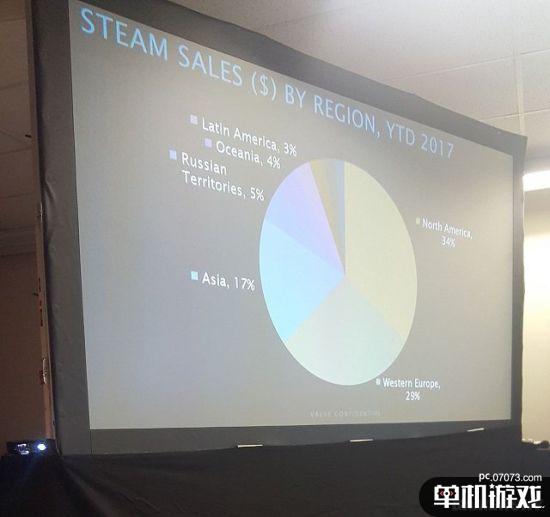首先是关于Steam总体情况。目前Steam共支持26种语言,48种本地货币单位,超过70种支付方式,内容服务器分布全球。Steam高峰期已有1400万的用户同时在线(2015年的高峰期为840万),每日活跃用户达3300万,每月活跃用户达6700万。自从2016年1月份以来,共新增2600万单交易,平均每个月多了150万单交易。自2017年以来,Steam的销量按照区域来看,所占比例为:北美:34%、西欧:29%亚洲:17%、俄罗斯领地:5%、大洋洲:4%、拉丁美洲:3%、其他:8%。