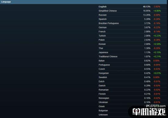 在语言统计表中,英语仍然是最广泛的使用语言,占比达到了40.13%,而这次简体中文在6月份暴涨4.86%,成功超越俄文爬上了榜单第二的位置,现为16.95%。这也印证着国区玩家越来越多的事实。