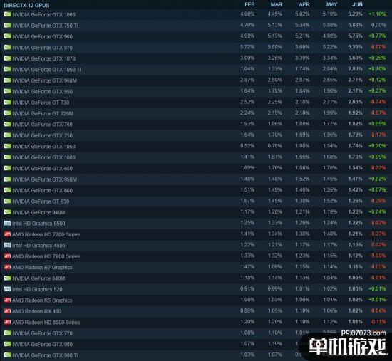 图表中,Nvidia可以说几乎垄断了整个Steam平台上的显卡份额,这可能是由于AMD最近没有显卡发布提供有力竞争的原因。此外,显卡榜上GTX 1060牢牢占据第一(占总比6.29%),作为目前最具性价比的甜品级显卡GTX 1060的确是获得了玩家们的认可,而排在其后的则是GTX 750Ti和GTX 960。