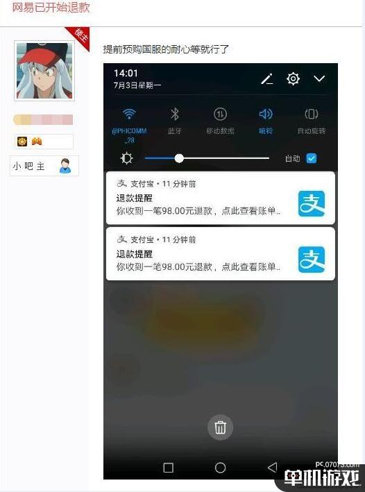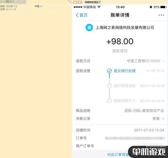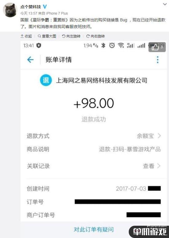 今天微博“点个赞科技”、NGA论坛、百度贴吧都有玩家表示,他们之前通过BUG链接购买了“国服”《星际争霸》的,而网易已经开始对他们进行了退款,之前支付的98元已经全额退还到了他们的支付宝账户上。此前误购买的玩家们,可以查看一下自己的账户,看看退款是否已经收到。