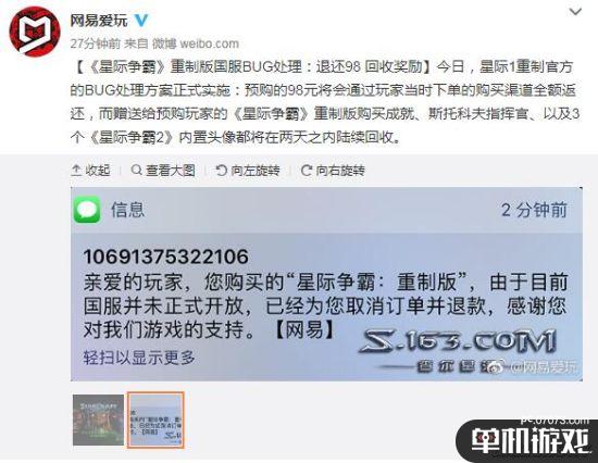 更新:网易爱玩官方微博已经发布消息,宣布从今日起正式实施星际1重制官方的BUG处理方案:预购的98元将会通过玩家当时下单的购买渠道全额返还,而赠送给预购玩家的《星际争霸》重制版购买成就、斯托科夫指挥官、以及3个《星际争霸2》内置头像都将在两天之内陆续回收。