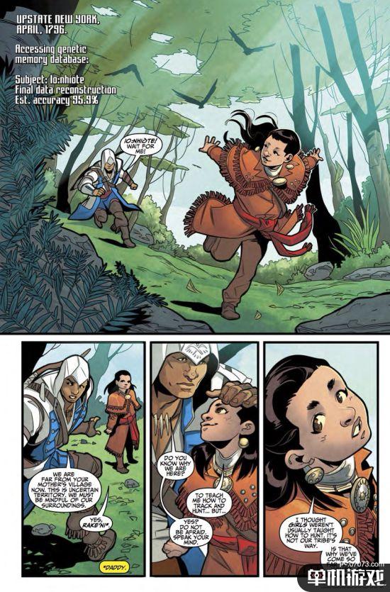 《刺客信条3》作为育碧原本计划的三部曲,承接了大量刺客圣殿战争内容,包括交涉朱诺的Desmond与其美国独立战争的祖先康纳,本来Desmond学习三大祖先的技能成为现代刺客,但被育碧取消改成被朱诺干掉。不过最近由Titan漫画出品的《刺客信条:映像》算是补完了剧情,康纳竟然有个女儿,长相美艳,武功超猛不逊他爹,一起来了解下。