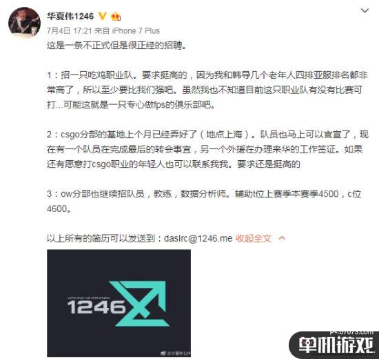 而在昨天,1246俱乐部经理发布了一条不正式但是正经的招聘微博:正在招收吃鸡职业队员!要求至少也要比“韩寒强”。