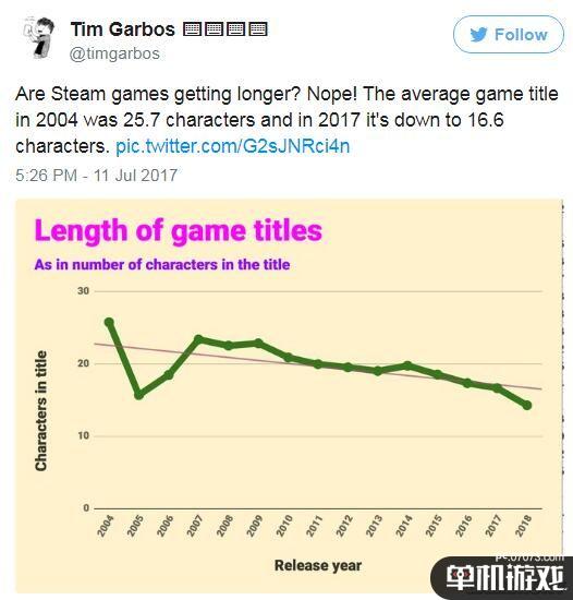 这里首先得感谢一下SteamSpy,几乎在所有有关Steam数据的新闻中你都能看到这个网站的名字。有一位开发者Tim Garbos专门从SteamSpy上搜集着各种数据,近日他提出了几项研究成果:1、“在2004年时,Steam上游戏的平均名字长度为25.7个字符,到了2017年这个数字下降到了16.6个字符。”2、Steam上名字最长的游戏,它的名字包含96个字符。3、现在Steam截图色调变得很暗。