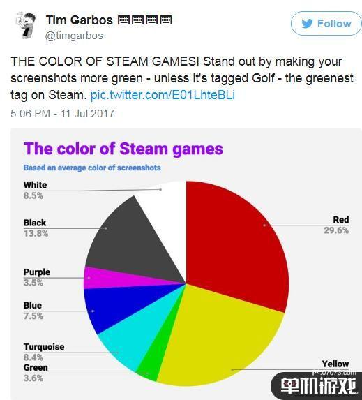 这个饼状图显示的是Steam游戏的颜色,根据截图的平均色彩统计得出。统计者认为给你的截图带上更多的绿色可以让你的图片显得更为突出——不过如果是高尔夫游戏就不必这么做了。