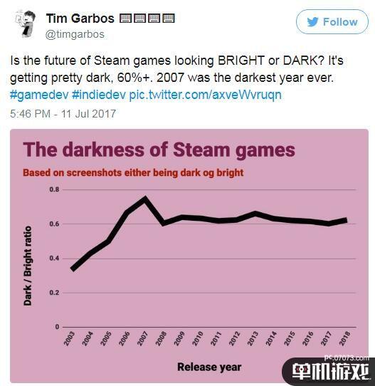 未来的Steam游戏看上去会更亮呢还是更暗呢?目前的暗度已经相当高了,达到了60%以上。2007年是“最黑暗”的一年。