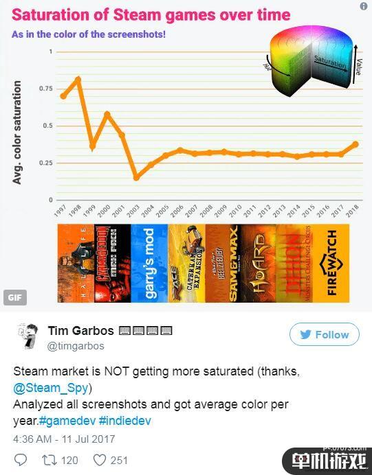 这张图表显示的是Steam游戏的色彩饱和度,统计者对每年的所有截图进行了分析,得出了平均色调的数据。