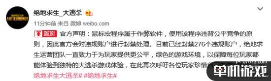 《绝地求生》官方今天在微博中发布官方声明:鼠标宏程序属于作弊软件,使用该程序违背公平竞争的原则,因此官方会对违规账户进行封禁处理。目前已经封禁276个违规账户。官方呼吁玩家珍惜自己的账号。不过随后官方也解释道,快捷键C+空格不属于此次封禁的鼠标宏,即使这个组合以鼠标快捷键或其他方式使用。