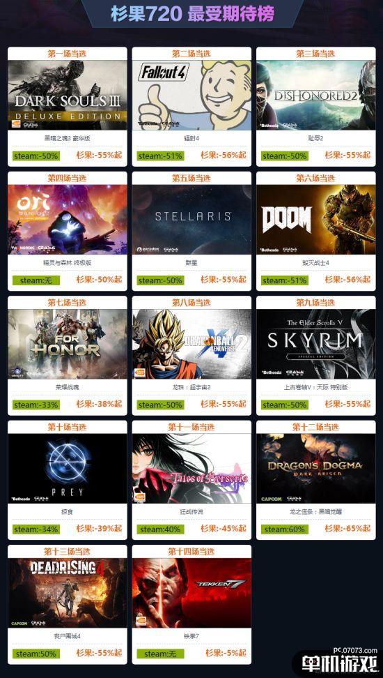 Steam夏促才结束没多久,杉果的720特惠就要来了,早先Steam夏促期间,杉果举行了“期待更低价”游戏投票活动,今日投票结果已经出炉,当选的14款游戏将在杉果720特惠期间比Steam夏促时更加优惠至少百分之五。