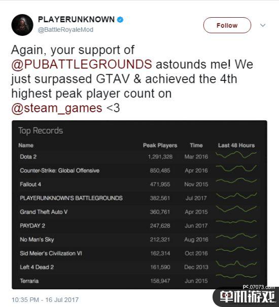 游戏开发者BrendanGreene通过Twitter宣布,《绝地求生:大逃杀》的同时在线人数创造了新记录,达到38万2561人次,超越了此前排在第四位的《GTA5》。目前,排在《绝地求生:大逃杀》之前的三款游戏分别是《Dota2》、《CS:GO》和《辐射4》。