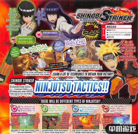 根据Jump周刊的消息,新的角色游戏将加入,他们是李洛克和日向雏田,前者有强大的连招技能,而后者会让敌人短时沉默无法释放忍术,杂志还简介了几位角色各自忍术的不同,春野樱显然是个治疗向的辅助角色、秋道丁次则是一个坦克型的防御英雄,保护队友的同时还可以用巨大身躯震慑敌人、宇智波佐助是一个远程支援型角色,会释放远程火球和AOE火焰攻击,漩涡鸣人可以从正面击破敌人,使用风类忍术吹飞敌人,