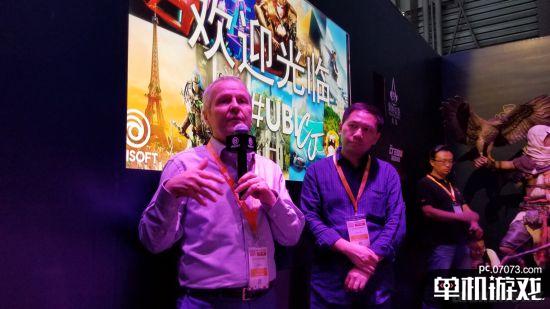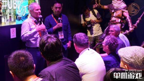 Yves Guillemot一来到育碧展台便受到了“里三层外三层”的热情待遇,想找机会拍张照片都非常难。和蔼的CEO随后也在小黑屋接受了国内媒体的采访,跟我们讲述了他眼中的Chianjoy。