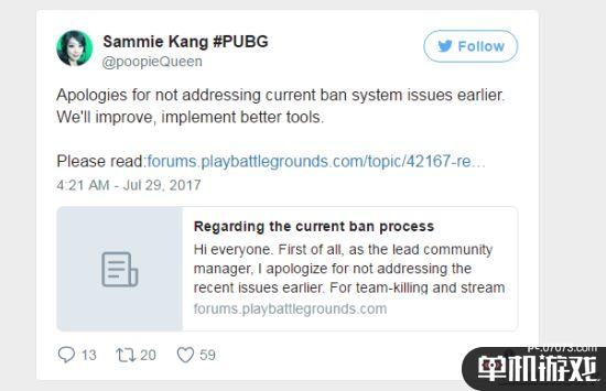 在引起热议后,《绝地求生》的社区经理Sammie Kang在推特上做出了回应,表示当前的封禁系统确实存在着问题。但同时澄清道,对于“TK队友”和“直播狙击”,我们都要求提供证据,不会因为社交媒体或者直播平台上看到的内容去封禁玩家。那些提交到论坛的证据是临时措施,只有当证据足以证明时,才会采取行动。