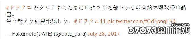 而近日,推特上一名叫Fukumoto(DATE)的推主收到下属的请假两天的申请,而请假理由居然是为了通关《勇者斗恶龙11》,实在霸气。这位上司也不含糊,大手一挥准假4天,实在霸气。
