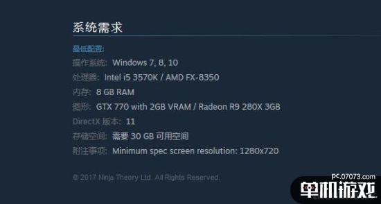 在游戏的Steam页面,已经有了一个最低配置单,Intel i5 3570K/AMD FX-8350的处理器,8GB内存,以及GTX 770 2GB显存/Radeon R9 280X 3GB显存,值得注意的是,这配置是在1280×720分辨率下的最低配置。