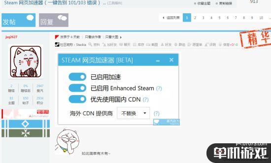 这段时间,Steam的101、103问题很恼人,之前曾有Steamcn论坛“羽翼城”发布过一款专修工具,用以解决该问题。现在Steamcn论坛用户jsq2627也发布了一款“Steam网页加速器”。