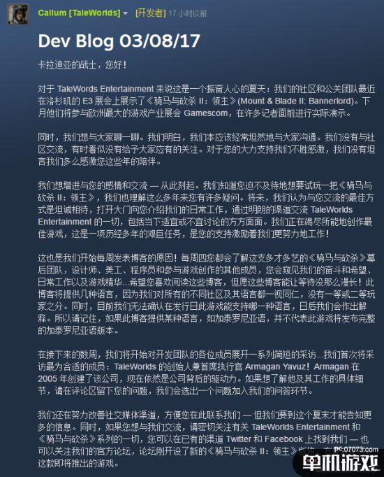 《骑马与砍杀2》官方今天在Steam社区发表了一篇中文通告,表示为了增加和玩家们之间的沟通,将从即刻起每周更新博客,根据语言设置了包括中文在内的几个子版块。