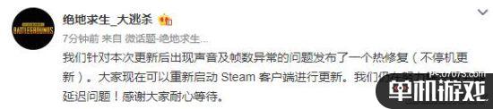 对于声音爆炸的问题,绝地求生官方微博今天早上称已经发布了一个热修复,玩家可以重新启动Steam客户端进行更新。