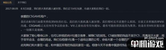 公告中称:我们在8月5日凌晨突然收到V社的红信,我们的大批机器人被封禁。我们暂时还不清楚什么原因,目前正在积极的和V社沟通。C5GAME已无任何有争议的业务,V社之前也没有任何通知。最有可能的原因是因为黑货,但是在有V社回复以前,一切都只是猜测。