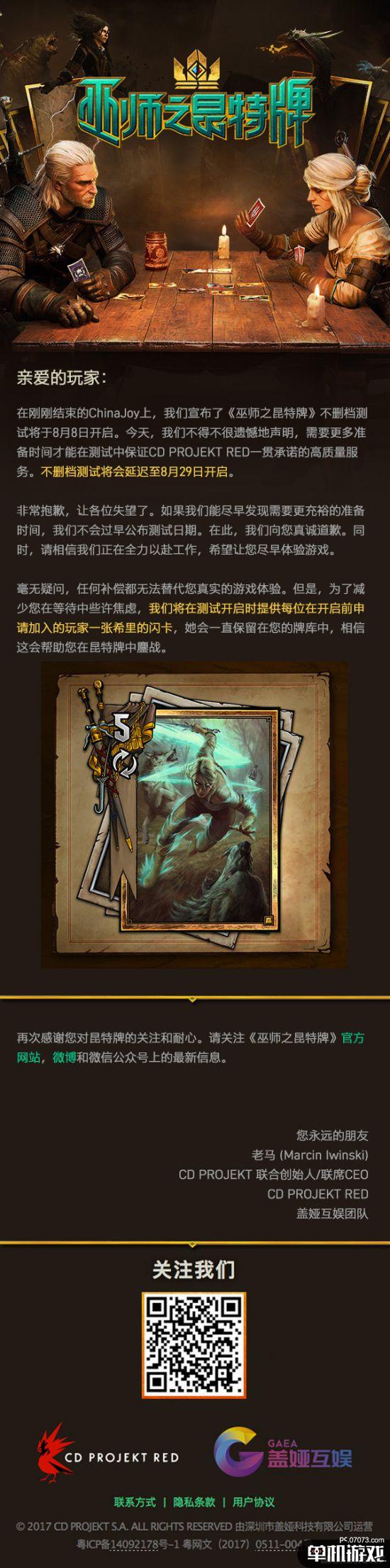 以《巫师》游戏为蓝本的卡牌游戏《巫师之昆特牌》原本将在8月8日开启国服不删档测试,但今日官方微博宣布,测试将延期至8月29日开始,并对玩家致歉。