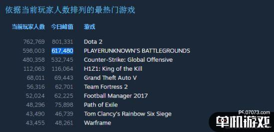 而同时在线人数,这个数据可以在Steam官方统计中看到。今日峰值已经达到了617480,现在的同时在线人数和今日峰值两个数据都已经超过《CS:GO》。并且有着一定的优势。