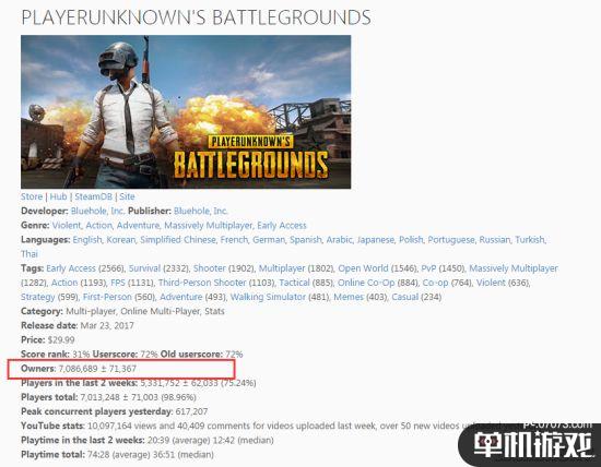 这次是来自SteamSpy的统计数据,显示目前《绝地求生》的用户数已经达到了7086689±71367。SteamSpy的数据存在一些差异的,但是一般不会太大。所以想来过不了多久Bluehole官方应该就会官宣这个好消息了。