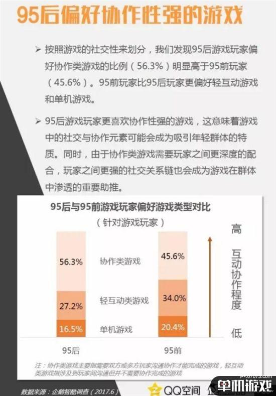 调查还发现,95后游戏玩家偏好协作类游戏的比例(56.3%)明显高于95前玩家(45.6%),95前玩家更偏好轻互动游戏和单机游戏。