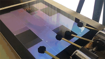 四根类似木琴演奏时的棍棒,连接到红色的驱动器以获取动力,通过「Teensy 3.0控制器」获取指令。