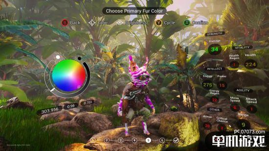 游戏演示一开始的镜头便是创建游戏角色,玩家可以选择性别、尺寸、毛皮类型、毛皮风格以及鬃毛和各种细节的颜色。