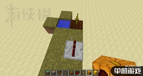 首先把南瓜种植好,确保只能生长在一个泥土上,如图(顺带一提,南瓜只能生长在草方块或者泥土方块上)。