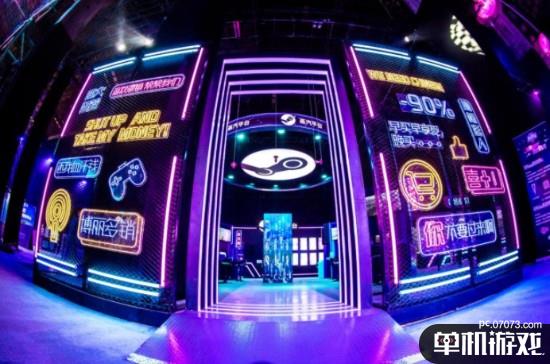 在完美电竞嘉年华会场中,蒸汽平台实验室颇为显眼,采用了流行的“赛博朋克风”:头顶是一个巨大的LOGO,灯光倾泻而下,四周围绕着机器。入场首先映入眼帘的是一面霓虹灯墙,V社标志性的红色阀门既酷又有创意,恰巧摆在眼睛的位置供玩家拍照,是展区地标性的打卡发朋友圈的地点。