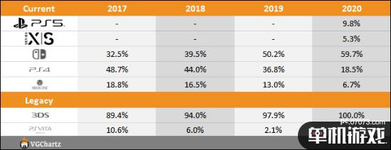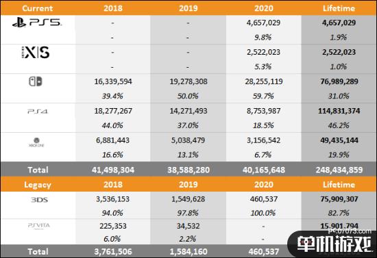 本次销量统计包括了PS5、Xbox Series X|S、Switch、PS4、Xbox One五个现有主机平台和3DS和PSV两款掌机。同时还显示了同一时期的游戏机的市场份额。