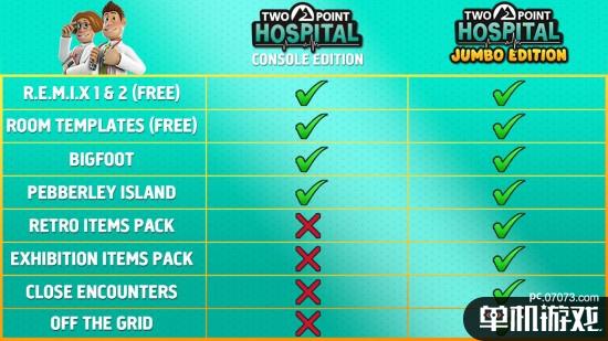 《双点医院:巨大版》包含全部四个DLC,两个全新道具包(包括27个医院,189种疾病和100+道具)和免费更新内容。玩家可以自行选择购买《双点医院:巨大版》或者单独购买新推出的两款DLC“失联”和“近距离接触”。