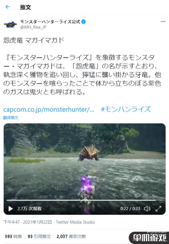 《怪物猎人:崛起》官推发了新短片,这次是怨虎龙的新动作演示。