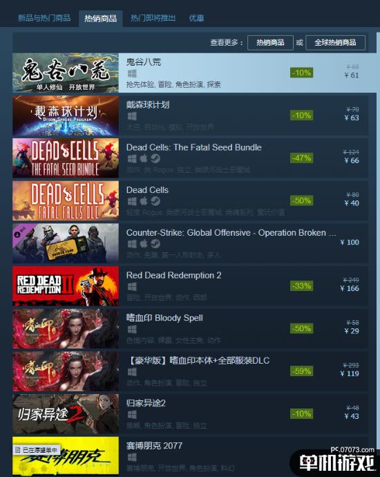 Steam热销榜更新:国产游戏《鬼谷八荒》、《戴森球计划》登上热销榜榜一及榜二,除此之外,推出了新内容的国产作品《嗜血印》以及推出EA测试的国产游戏《归家异途2》也成功上榜。