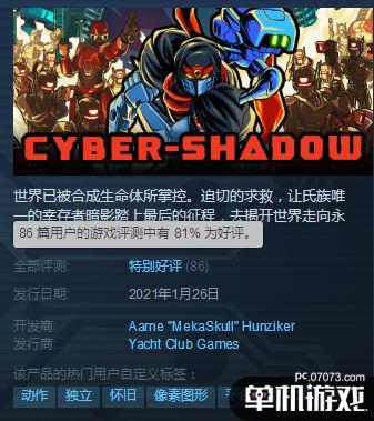复古像素风横版动作游戏《赛博暗影》在Steam上虽然评价不多,但总体好评。