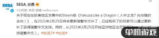 世嘉今日正式宣布:《如龙7》将于2月25日登陆Steam平台亚洲地区,并支持繁体、简体中文;此外,在欧美区Steam平台购买的《如龙7》也将于2月25日推出繁简体中文补丁,玩家届时可以购买/下载更新补丁,以体验中文版《如龙7》的快感!