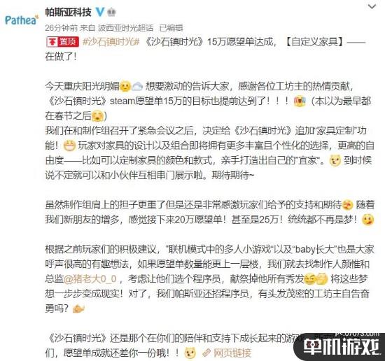 今日帕斯亚科技发布微博宣布,《沙石镇时光》在Steam商店已经达成“15万愿望单”成绩,而这次他们决定为游戏追加“家具定制”功能。而上次达成十万愿望单的时候,官方决定为游戏增加“化妆功能”。