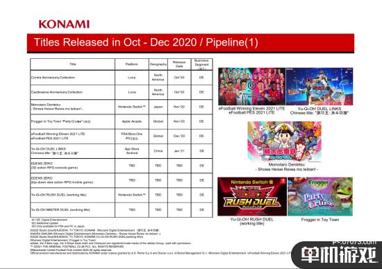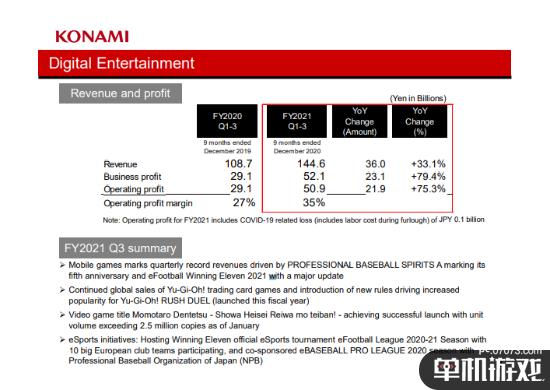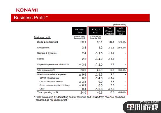 Konami2020年截止至12月31日的九个月间,公司总营业利润458亿日元,较上一财年增长36.4%。营业总利润405亿日元较上一财年增加69%。