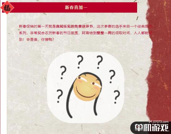 第一天开始,将有一个来自经典游戏系列的选手参与喜加一环节,整整一周时间可领取。