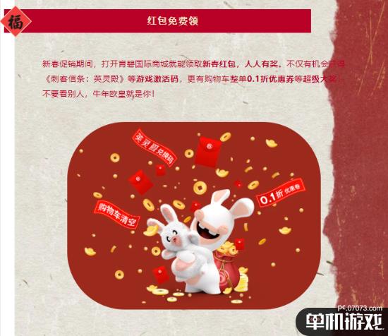 春促期间,打开育碧国际商城就能领取新春红包,红包内有《刺客信条:英灵殿》等游戏的激活码,还有购物车整单0.1折优惠券等超级大奖。