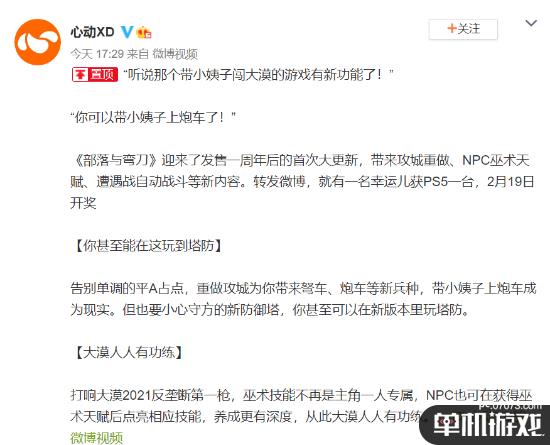 《部落与弯刀》迎来了发售一周年后的首次大更新,带来攻城重做、NPC巫术天赋、遭遇战自动战斗等新内容。转发微博,就有一名幸运儿获PS5一台,2月19日开奖