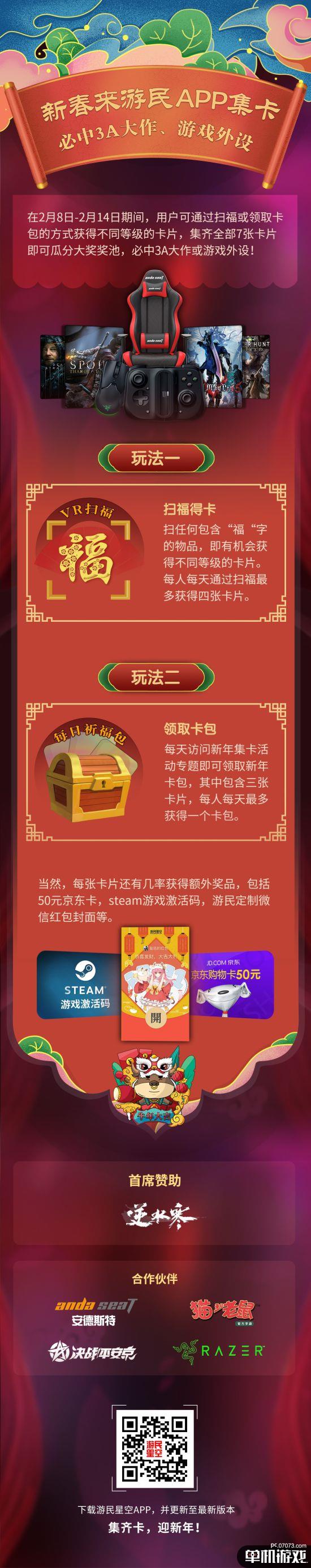 我们的新春集卡活动将会在明日上线!在2月8日-2月14日期间,用户可通过扫福或领取卡包的方式获得不同等级的卡片,集齐全部7张卡片即可瓜分大奖奖池,必中3A大作或游戏外设!除此之外,每张卡片还可参与抽奖,有机会获得Steam激活码,50元京东卡,游民定制红包封面等奖品。