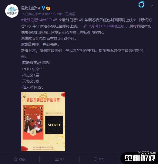 《最终幻想14》官方微博公布了牛年新春微信红包封面,将于2月8日10点准时上线,届时使用微信扫描微博公布的二维码即可领取使用。