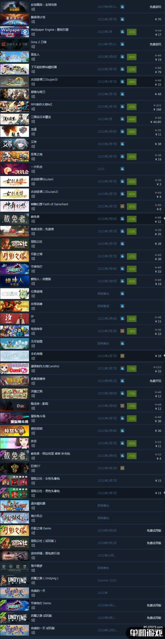 蒸汽平台今日开启先锋测试,目前已经上架了51款内容,包括《Dota2》《CS:GO》《戴森球计划》《了不起的修仙模拟器》《古剑奇谭》《神舞幻想》《汐》等游戏,软件《壁纸引擎》,以及一些DLC和《完美的一天》《苏醒之路》《节奏快打》的试玩版。页面风格整体和Steam一致,不过目前内容还比较少。